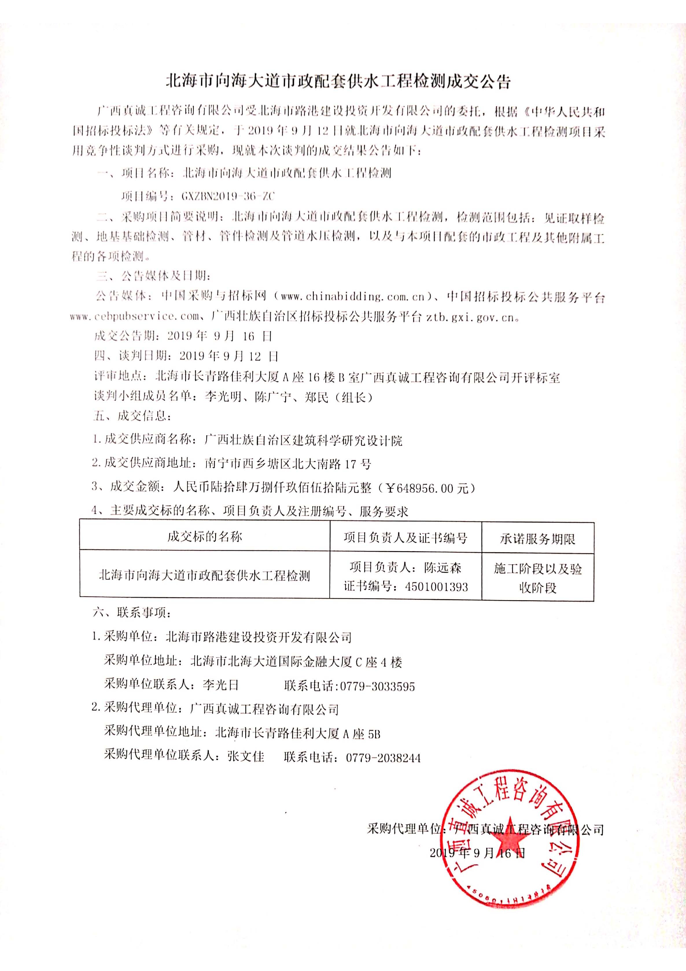 北海市向海大道市政配套供水工程檢測(cè)成交公告